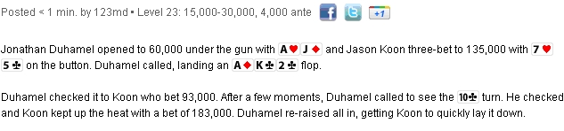 если не это, - хотел понять: тут где-то Кун прокололся, и я чего-то в самой логике раздачи упустил, или же чемпионский покер получился оттого, что Дюхамел как-то динамику/предысторию использовал или применил хитрый ридс?