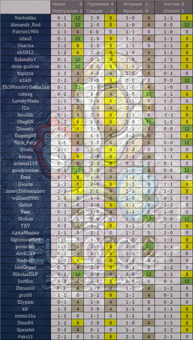 1) почему есть раздница в присуждение очков в группе и в плей-офф, по моему сложность предсказании встречи к примеру Голландии с Германией в группе обсолютно равна если они встретятся в плей-офф