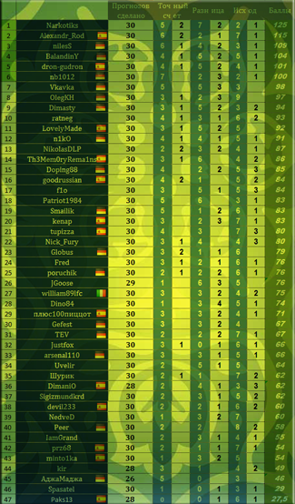 При равенстве очков у двух и более игроков - выше будет стоять тот, кто угадал наибольшее кол-во (во порядке убывания значимости): 1. счетов 2. разниц 3.исходов