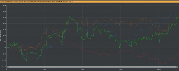 Теперь о нынешней ситуации. Мне пришлось много вывести в конце года, вложить в бизнес, что оказалось очень правильно, но и времени отнимает очень порядочно. После этого БР стал очень напряженным, натянутым как струна, это все время как-то накладывает отпечаток и бьет по нервам, особенно когда он при этом еще и скачет дико вверх/вниз. Вначале года кэш реально вогнал меня в жесткий минус, я даже на время от него отказался, играл снгшки на 180, мтт и сателиты, все это игралось в плюс, кроме мтт правда, но большой прям прибыли не приносило. Да и удовольствия меньше от покера получал в это время. В итоге все же май выдался успешным, чуток на скупах, 2е место в турбо ребайнике (~3800) и достаточно успешный ПЛО Зум привели мой БР в терпимое состояние. Видимо я расслабился, поехал еще на РПТ с друзьями в Одессу, взял четвертое место в Чемпионате Украины, поделив по ICM в четверке, правда шортом самым. Приехал после этого домой, начал снова Зум 0,5/1 и 1/2 где меня за 10 дней напринимали как хотели и как могли. Плюс еще и МТТ играл дорогие, хоты по 75, 55, турбики по 100, что тоже не способствовало поднятию БР и самооценки. Результат: имеем 1500 онлайн БР, и не желаем вливать в него деньги извне, так как мы видите-ли не привыкли так делать. Правда в крайнем случае я все-же вынужден буду это сделать.
