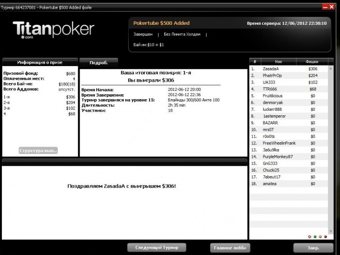 Излагаю пренеприятнейшую для меня историю, которая началась с заноса 1-го места приватника на титане за 11$ 12.10.2012 и вылилась в блокировку моего единственного аккаунта на титане и в айпокере в целом. ( я это поясняю предвещая сразу вопросы про мультиаккаунтинг ). Турик этот шел уже довольно давно, но я занимал там максимум 2-е и 5-е и раза 3 вылетал на бабле. Последний раз именно так и получилось и мне пришлось делать депозит на сумму 23$ чтобы сыграть 12-го числа. В общем то мне тогда везло + я как обычно подключал фантазию и пару раз параметр стиля моего блефа буквально зашкаливал )) Итак 1-е место принесло мне ( как оказалось только виртуально ) 305$ Припоминая, что вроде бы нельзя ставить на вывод в тот же день, что и делал депозит я закрываю титан и укладываюсь спать. На следующий день я зашел в свой TTR130750092 и поставил 290$ на вывод и 27$ оставил в руме для последующих баинов этого же турнира. ( никакого кеша, мтт или других турниров я тогда не играл и не играю в принципе ) Деньги я оттуда уже выводил, то есть акк был подтвержденный, поэтому я попытался зайти вновь в свой акк только через 2 дня, когда не увидел денег на кошельке в moneta.ru от титана. Попытка входа не удалась - временно заблакированы... срочно свяжитесь с нами и т. д. Я сразу же пишу им письмо на supportru@titanbet.com в котором вопрошаю что с моим аккаунтом, почему он заблокирован. ( писал именно с того ящика, который указывал при регистрации, так как в папке входящие осталось их рекламное письмо, где они обращались ко мне по имени ) Прождав день и не получив никакого ответа я отправил им письмо на англ. на support@titanbet.com и оставил заявку на перезвон по их бесплатному номеру - в ответ опять тишина ! Не понимая, что происходит я изложил суть проблемы на форуме аффилейта этого турнира, там мне посоветовали пообщаться с ними в лив-чате на сайте titanbet.com но проблема в том, что этот чат не доступен в зоне ru. Хорошо, что я кроме того, что хорошо диаложу и понимаю по англ. еще разбираюсь в компах, поэтому меня это не остановило и я воспользовался для зажигательной беседы с их поддержкой программой tor которая подменяет ip для браузера, чтобы titanbet.com открылся как для англоговорящего. То есть понимаете сколько сразу бы отсеклось людей в попытке прояснить ситуацию и какой непростой квест надо пройти, чтобы получить простые ответы. Итак я изложил ситуацию на живописном английском и без матов, девушка сказала, что на 3 моих письма они отправляли 3 ответа на тот же ящик с которого я посылал ( я проверил ). Почему же тогда мне приходят их промо письма и не доходят их письма с поддержки ? Я этого так и не понял, но проблема не только у меня, я смотрел в инете. Я попросил ее либо переслать на другой ящик либо выложить в этом ливчате. Пересылать она отказалась так как этого нельзя делать, в чате же русская кодировка писем была нечитаема. На вопрос почему мой аккаунт заблочен, Она отвечала одно и то же: аккаунт навсегда закрыт и открыт не будет, это финальное решение их невероятно крутого финансового отдела. На вопрос что с выводом на этом аккаунте. Она спросила - какой вывод ? Я ей говорю 290$ должны были уже давно отягощать мой кошелек. Ах да был вывод, но он отклонен. Меня вся эта ситуация уже давно бесила, поэтому я ей сказал что их мэнеджеру просто необходимо как можно быстрее решить эту чудовищную ошибку с их стороны, так как у меня уже буквально заканч