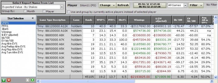 Ты чаще выигрывал снизу. Зато по фишкам недодача. Может быть вызвана одним глубоким проходом и проигранным алином сверху. Статы с мтт? Или с мтт и снг?