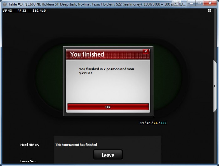 В итоге, сыграл два турнира + 6 столов кеша, в одном из турниров получилось занять второе место. Вот это по нашему, хотя совсем по нашему было бы первое место.. но победителю против меня очень сильно перло, сначала я удвоил его на предфиналке с K8 против его АК, потом в 3максе проиграл ему огромный банк с AT против 68 на борде А597J (в поте было около 50% фишек турнира) ну и в хедсапе ему повезло почти сразу словить кулер в свою пользу