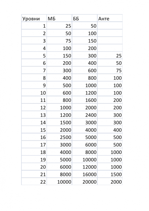 Уровни по 45 минут. Стартовый стек 10.000 фишек.