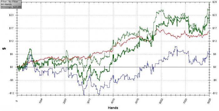 Играю в покер на реальные деньги около двух месяцев на PS. Время на игру выделяю немного, поэтому играю дешевый кэш, разбавленный небольшими СНГ по 10 и 25 центов. Из литературы читаю Хэррингтона и Мошмана. Много упоминаний о Склански, но я всячески противлюсь открывать его книги, не уверен, что глубокая теория действительно поможет в игре (возможно, я ошибаюсь). В игре стараюсь принимать решения на основе вычислений в pokerstove.