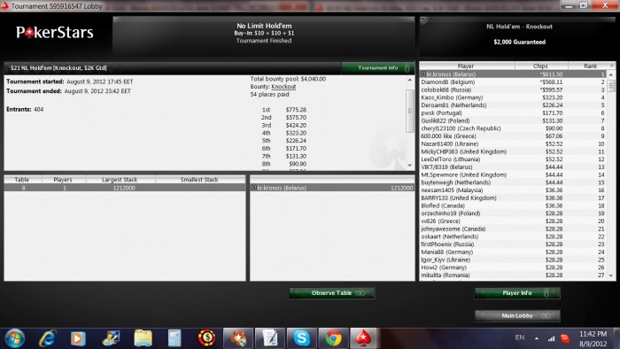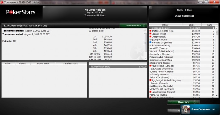 начали сдрузьями выпивать и я допускаю в который раз одну и туже ошибку - сажусь катать НЛ 50 кеш ХА. Мда. заливаю там долларов 80 и думаю:"У меняя же нормально получается играть МТТ. Какого хера я постоянно замазываю тут лавэ???". Какой здесь выход? Правильно, простозаблокировать кеш-игры и всё. И тут видимо о себе даёт знать алкоголь) Вместо того, чтобы залочить кеш, я блочу аккаунт до февраля 2013 года. Ну разве я не идиот??? Вот такие пироги. Ладно, хрен сним с акком. лавное, что теперь наГТ не могу продавать доли как раньше (а ихраскупали оченьдаже неплохо). Скоробудет новый аккаунт, но видимо будет сильно подозрительно на этотакк продавать доли, да я и неуверен, что будут покупать (ведь все боятся быть обманутыми и это правильно. Так что на время мне пришлось попращаться со старзами и я задепил 800 бачей на пати, который привязан к Покерстрэтеджи и начал играть там МТТ. Пати, как мне кажется, одно из самых сладких МТТ полей среди всех покер-румов, но единственный минус в том, что во-первых этих турниров мало, а во-вторых в нормальные турики БИ начинаются от 20, что не совсем по БРу (хотя это меня мало когда останавливало). Ну и начав играть эти МТТ всё начало складываться просто хреново: постоянные недоезды, много предфиналок с маленькики ИТМами, нетащащиеся коины за чиплидерские стеки и тому подобное. Ну что подеалть будем сражаться, хотя БР оставляет желать лучшего. Дело в том, что на пати ещё и сильно доли не продашь: там с переводами всё как-то напряжно, я имею ввиду что надо доки отправлять какие-то и т.д. Недавно приехал к родственникам в Гомель, нашёл покерный клуб (кстати очень понравилась обстановка и обслуживание) и там сыгралсразуже ребайник за 100 белорусских рублей (12 у.е.). Структура там так себе: стек 3500, блайнды 25-50 по 20 минут. Единственное приятное - это аддон 7000. получаетс,что если даже прийти в период аддона и взять одинарный стек, то у тебя стек 33ББ, что для такоготурика очень даже недурно. Заходило неочень, ноизвсехрук что быливыжимал максимум. Всего было 29человек и когда оставалось топ14 у меня был стек приблизительно 30ББ, что было где-то 1.5 средних. Сначало кулернуло ДД в АА на пол стека, а потом поставил с СО в 6-максе А6с с СБ инста репуш на полстека с А7с и мы даже не поделили. Печачль, аут 11-м.