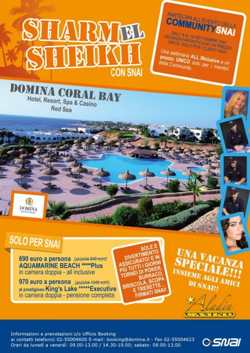 Казино Аладин совместно с известным итальянским игорным провайдером "Snai" приглашают любителей покера в отель Домина Корал Бэй(Шарм-Ель-Шейх) с 8-го по 15-е сентября для участия в турнирах и кэш-играх! Главное событие - 220 евро. Ожидаются также турниры с buy-in 75,100, 150 евро. Уникальная возможность совместить отдых у моря и любимую игру !