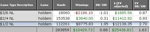 точно хз, навскидку около 5к наверное, и зачем ты заставил меня посчитать, так много денег=\ От тренировок отказался последнее время, так как видел просто тонну мест, которые могу разобрать сам, да и плюс своих мыслей и идей сейчас хватает, вот только реализация хромает, по-моему в августе кроме, как сесть покатать, в плане покера, я больше ничем практически не занимался=\