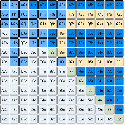 Если он ставит весь этот диапазон, то колл у нас по шансам, но если допустить, что он не всегда пробетает велью/тонкое велью, по причине того, что мы смотримся часто на чек/пасс, ну либо сайзинг другой выберет, какой-нибудь гейский, так как защищаться ему вроде не надо, потому что все сильные дро я думаю он ожидает, что продолжат, то колл наш еще лучше.