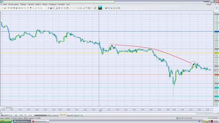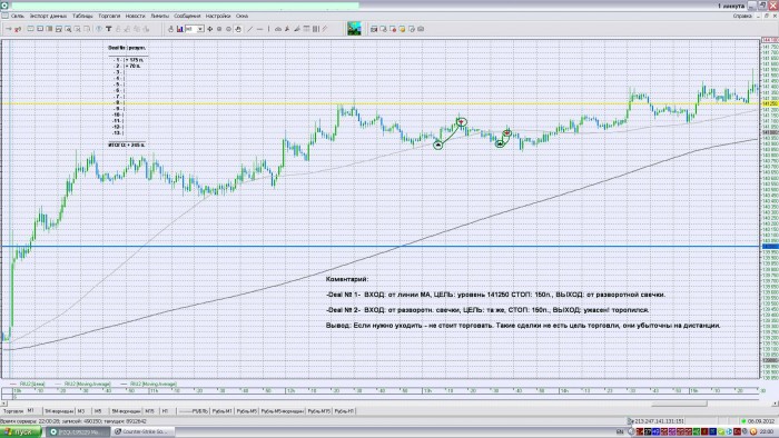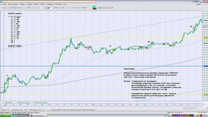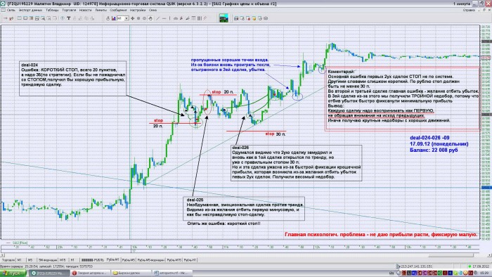 (Пятница) 07.09.12. Счёт: 21 820 руб. Мне реально стыдно выкладывать этот отчёт, но "назвался гусём - полезай на стол". Совершенно не дисциплинированная "мелочная" торговля. Никакой выдержки. Хорошо хоть против тренда не пёр, сошлюсь на неопытность в ловле подобных движений, исправлюсь.