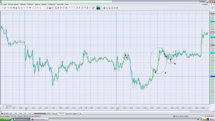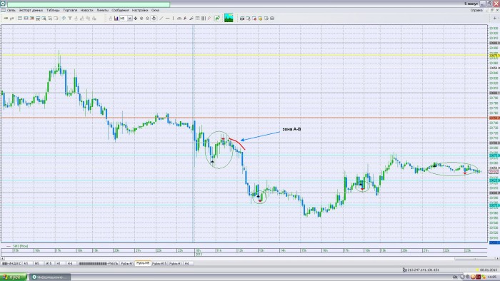 08.01.13 Результат: - 3 пункта ; кол-во сделок: 4. Примечание: сразу после 1ой сделки образовалась так скажем зона А-В, в которой было по крайней мере 2 сигнала к продаже на минутках, которые я благополучно игнорировал. Причина тому - моя инертность в направленности сделок, др. словами если я первую сделку совершил на покупку, то меня как бы заклинивает и дальше искать сигналы на покупку и стараться игнорировать сигналы на продажу. если честно пока трудно представляю себе как с этим бороться.