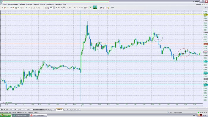 10.01.13 Результат: - 53 пунктов ; кол-во сделок: 7. Примечание: Не очень удачная получилась 6-ая сделка, вынесло на короткий стоп и пошла в нужную сторону, т.к. за новостями не слежу то даже не знаю что за новость дала такой импульс, хотя такое часто бывает и без фундаментала.