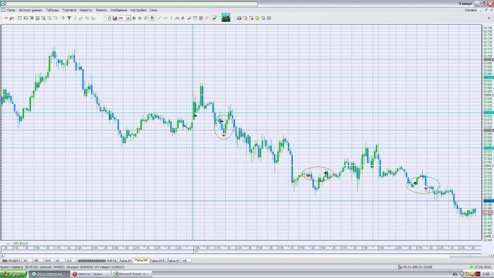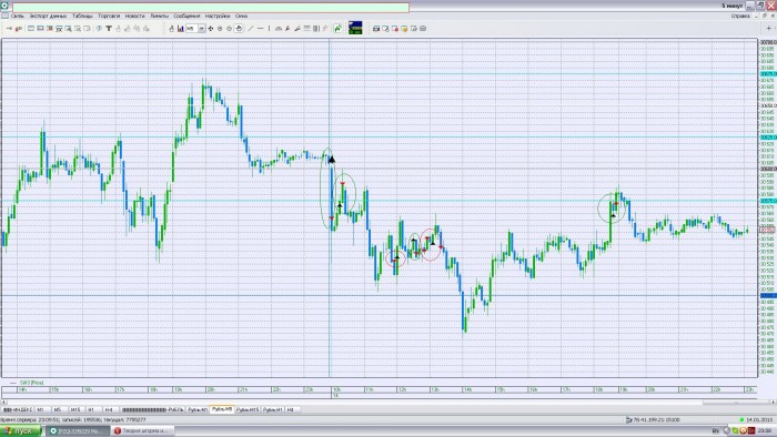 АЛГОРИТМ: ВХОД: Перед входом оцениваем предстоящую ЦЕЛЬ (!!не входить без цели!!) и СТОП. Входим по м1, следим за ценой по м5. Вход не противоречит МА. На м5, м1 формациях сохраняется трендовое соотношение (min – max). Отслеживать открытую сделку раз в 30 мин., не чаще.