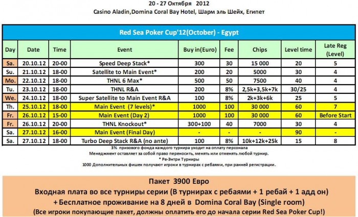 Red Sea Poker Cup является одной из самых популярных зарубежных серий у российских игроков. Событие уже успело стать традиционным для многих любителей покера, регулярно посещающих Египет для участия в турнирах от Покер Клаб Менеджмент. По вашим многочисленным просьбам мы организовываем серию из «демократичных турниров». Предлагаем бесплатное проживание игрокам, приобретающим турнирный пакет: стоимость пакета 3900 евро