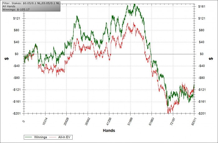 Реальное состояние моей игры далеко от идеала, в отдельных моментах я понимаю, какие грубые ошибки совершаю за столами, самая большая ошибка, с которой я борюсь и довольно успешно - это колл рейзера в холодную с позиции CO или BU с разным мусором. Одномастные коннекторы, бродвей, иногда даже связанные пары типа коннекторов 69 или 36. Это лудоманство даже и не знаю с чем связано, но последнее время после разбора своей статистики и раздач я конкретно начинаю избавляться от этого лика. Никак не могу побить NL 10, в определенный момент мой бр подобрался к отметке в 600$ и я готовился перейти на NL 25 но даунсвинг, который длится по сей день откатил меня обратно к самому началу лимита NL 10.