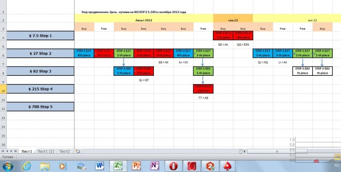 У меня задача - отобраться на WCOOP 2013 $ 5200. Просто я решил поэкспериментировать в октября и как итог: ушли для билета 4 уровня. Может еще и сыграю в миллионники до Нового года, если будет билетов хотя бы пять штук - 4 по 215 баксов. Для себя я уже решил, что через steps отбираться лучше, чем через саттелиты: не выиграешь, то хотя бы высоки шансы получить билет текущего уровня, а это - лишние FPP, которые можно потратить уже на обычные саттелиты, те же Sunday Storm.