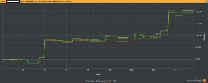 Всем привет! Зовут меня Денис. Живу в Саратове. В покер играю слишком давно. Переиграл во многие разновидности, но вот омаха понравилась больше всего. У меня есть основная работа, которая приности мне определенный доход и возможность играть в покер. Так уж вышло, что менее чем через 3 года я заработаю пенсию, и мне бы хотелось к этому времени, что бы мое хобби приносило еще и доход. PLO 200 думаю меня вполне устроит. Сейчас играю PLO 50 иПокера с 60% РБ. На работе на ноуте 4 стола, дома 6 столов. Иногда по игрокам открываю и 100-е столы. По выходным играю турниры недорогие на разных сайтах. В турнирах самый большой занос 3 место на ПС за 3,30 около 5 тыс. В офлайн иногда в местный похаживаю, но структура турниров убогая, через час начинается коллективная пиханина с определением счастливчика. До вычеркивания покера из видов спорта регулярно попадал в призы в офлайн турнирах. Буду выкладывать раздачки и постить графики со статами, мож чего подскажите, будет очень интересно послушать. БР на сегодня 1800$ на сайте и 3500$ в резерве. Сентябрь не радует