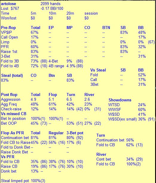 Там тупо нет руки. Просто не повезло. Как ни играй, а больше фишек врядли получишь. Поэтому 3бет норм. Правда смотрится уж слишком сильно. Еще и агрессия к риверу падает - не думаю что получим кучу блефов. А размер 3бета да- чуть побольше можно сделать - сотик сверху его ставки будет неплохо. Так и блефовать недорого и под пуш ривера банк подгоняется.