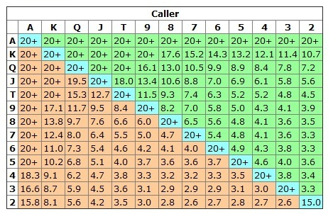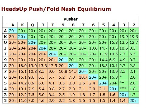 Если было бы все так просто)) Эти таблицы сделаны против опов, играющих по диапазону неша, чтобы получить ЕВ=0. И я не знаю человека, которые балансируют свой пуш АА с 20бб пушем T6 c 20 бб.. ))) Даже вообще опен пуш АА при 20 бб уже смешно) не говоря уже о T6.