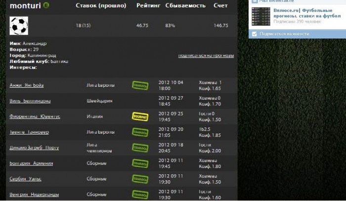 Здесь я, если позволите, буду публиковать свои размышления и прогнозы на футбольные матчи. Мою статистику можно просмотреть в моем профиле на Вплюсе.ру (http://www.vpliuse.ru/ya-monturi) или на прилагаемом скриншоте, на данный момент процент сбываемости - 88%, yield - +46.75%. Старые мои прогнозы можно прочитать по той же ссылке, однако все новые прогнозы я, если позволите и если это вам интересно, буду дублировать сюда.