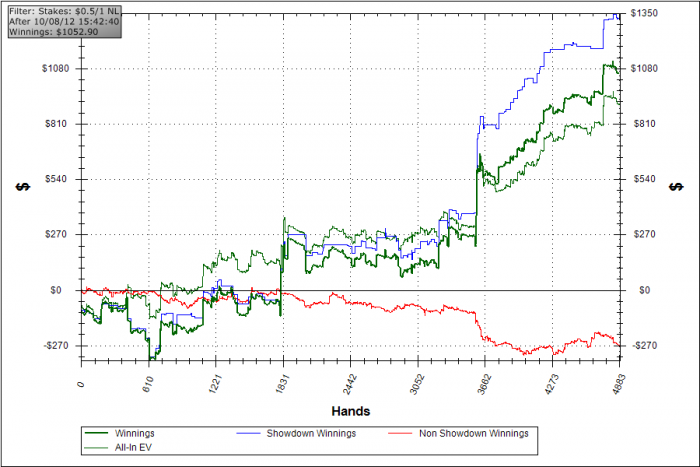 начал я с нл100 по 12 столов отыграл примерно 40к рук (завтра выложу график)