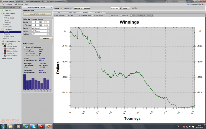Всем привет! Меня зовут Артём. Ник на стазах ART_Temon. В покер играю с начала июля 2011 года (Тогда получил билет на ежедневные фрироллы от pokerstarter для новичков). Более менее успешно начал играть с конца мая 2012. Всегда относился с иронией к игрокам, умудрявшимся залить весь свой БР, так как сам очень ответственно отношусь к ведению БРМ (100 БИ на лимит, на котором еще не играл, для мтснг 180 макс - 150 БИ) Но недели 3 назад я начал лудоманить, что мне не свойственно и играть некоторые турниры, Би в которые составлял по 3-4% от БР, а иногда и до 10%. Плюс мне сильно не перло, и, как итог:
