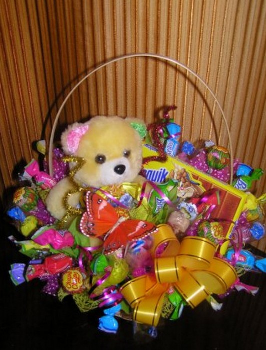 Букеты из цветов с конфетами,вином или мягкой игрушкой-станет отличным сюрпризом для юбиляра или в день свадьбы.