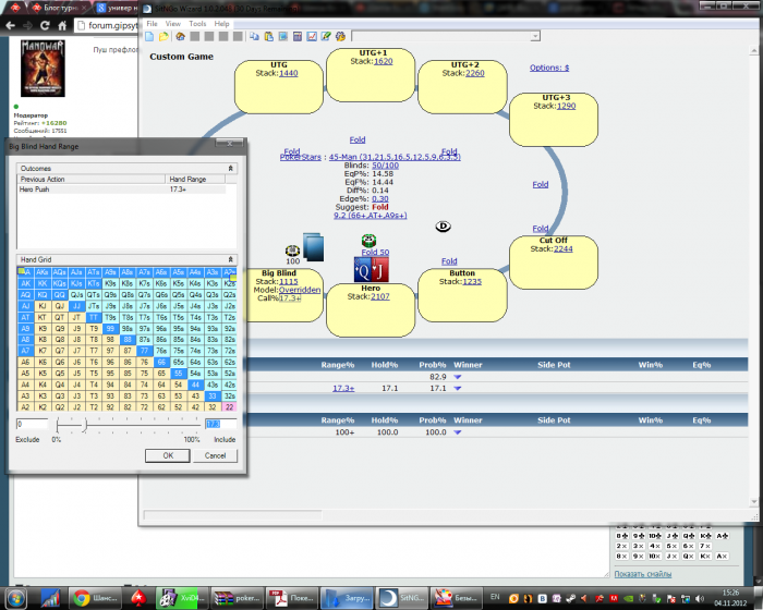 2. дятел, который играет постфлоп с 12ББ за плечами - это совсем не 17%, а ближе к 60%.