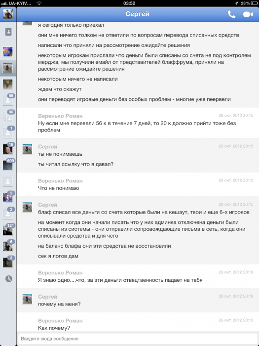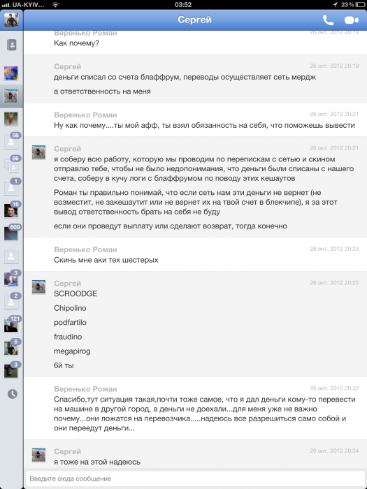 На моё утверждение о том, что ответственность за списанные деньги лежит именно на нем, Сергей ответил: "почему на меня??? деньги списал со счета блаффрум.перевод осуществляет сеть мердж. а отвецтвеннось на меня ?"