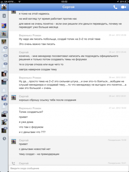 [08.11.2012 17:56:17] Веренько Роман: Сергей ... что это за куйня ??ты говорил что в вторник ...а уже неделя прошла ... а денег нету