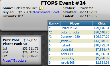 Очень плотно болел и поддерживал ребят с марафона 100К в месяц, и на волне позитива сделал свой скромненький занос. Обновил свой прошлый максимум с 17К (биг109). Сегодня ночью занес фтопс. +29К с копейками. Перед этим с момента старта марафона ишел в минусах на 2500. На ФТП ранее практически неиграл раньше, а если и играл то немножко микролимиты.