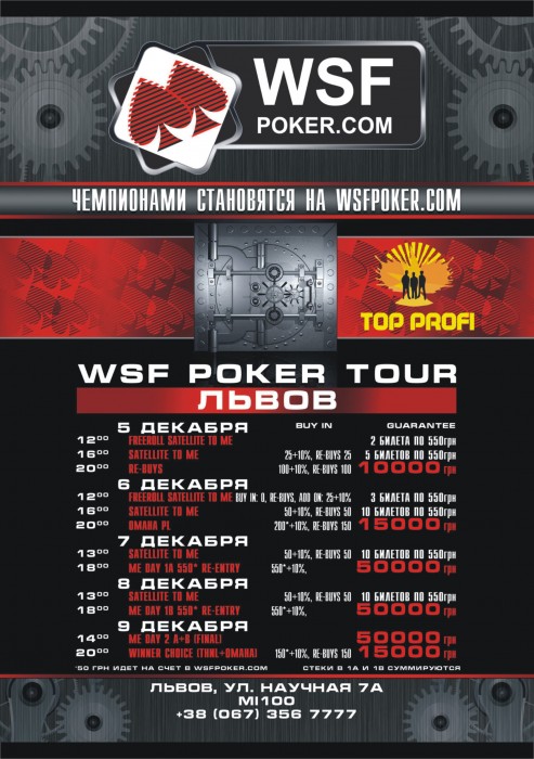 Уже второй турнир новой мини серии WSFpoker будет проходить с 5-9 декабря 2012 года в клубе покера TopProfi Украина, г.Львов РЦ Ми100, ул. Научная, 7а