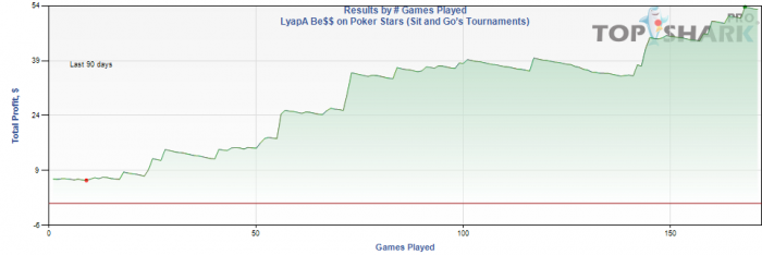 Games played: 171 Average profit: 0,31$ ROI:152% Total profit: 53,07$ Average buy-in: 0.20$ ITM: 25%