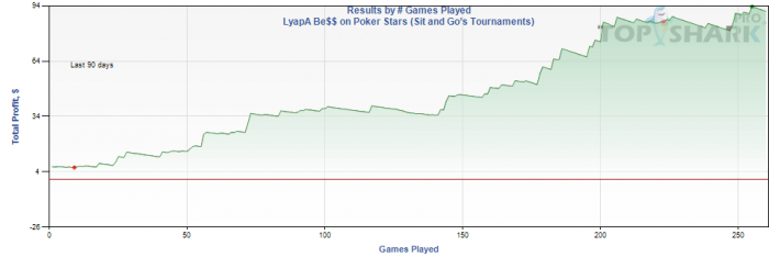 Статистика: Bankroll: 87.65$ Games played: 260 Total profit: 91.03$ Average profit: 0,35$ ROI:114% Average buy-in: 0.31$ ITM: 25%