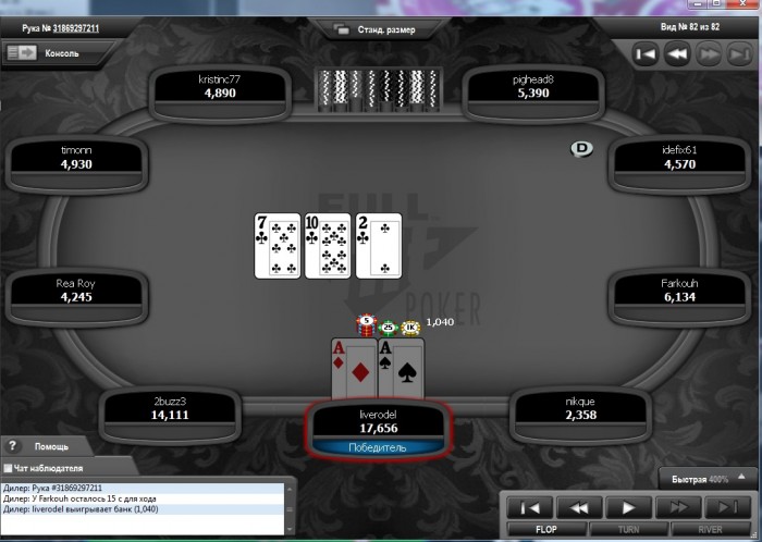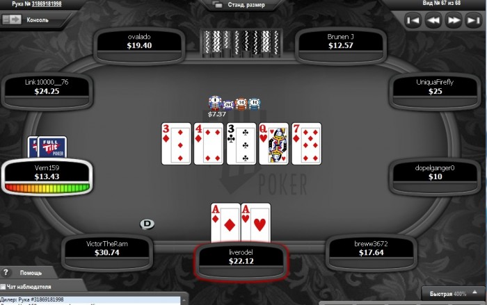 Когда я вижу такой ривер я смело иду в пас. Среднее мое значение 35к-55к рук в месяц и тузы в кэше это лучше закрыть стол и сесть за другой. Мне нравиться, когда заходишь со стеком и за рук 200-300 наигрываешь в 2,5-3 раза и начинается. За последнею неделю десятки таких случаев.