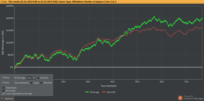 кстати установил покер регистратор,тк я попутно открываю мтт пару столов ,он меня дваждыкакого то хрена регил турбо 109 секонд шанс,сегодня мог досидеть до призов тк было 2ср стекана 70 тел но играл как турик по 8баксов и не дало 2 раза проигралл снизу правда .спрева короткого закрывал на ТВ а после открыл КТ в блайды и флоп с натс фд выставился вс заслоуплееных QQ ,было обидно тк мог со ср в топ 36 войти и призы 318 баксов и там бы запихнул бы стек... ну хоть отдыло в 30ках хоть ибыл расстроен и сердит... вотграфик января
