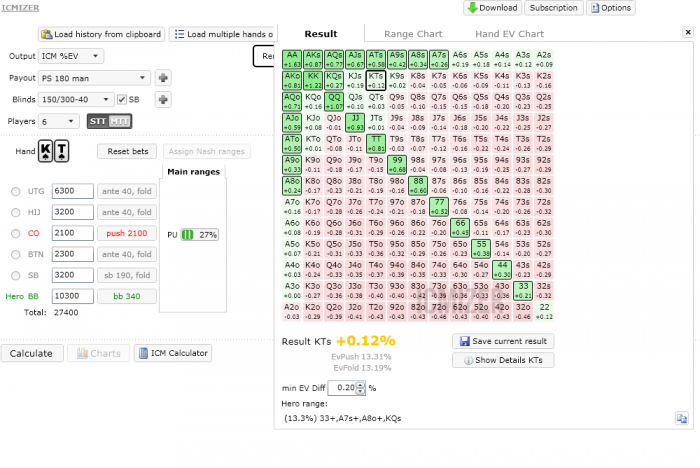 Против того диапазона, который ты указал, у нас по ИСМ слабоплюсовый дисперсионный прием, увеличивающий нашу долю в призах относительно фолда до 13,31% против 13,19% Рекомендуемый ИСМайзером при эдже по умолчанию диапазон приема 33+,A7s+,A8o+,KQs При проигрыше, а он наступает с вероятностью 54%, - мы теряем 11% от нашей доли в призах. Матожидание от приема меньше 1%