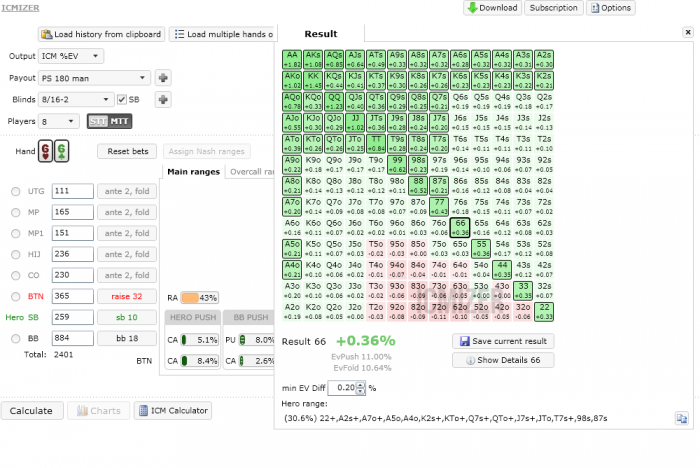 На первый взгляд спот очевидный и играя сессию, я не особо придав значения зарестиллил,но потом осознав то что я шел 3им по фишкам и то, что были стеки более чем в 2 раза короче меня понял что тут не все так просто,вспомнилось понятие множителя бабла, в общем по прошествию некоторого времени повторил эту тему и просчитал эту ситуацию в ИСИмайзере,правда возможно я что-то сделал не так,так как опыта большого в проведении таких двухсторонних и глобальных подсчетов у меня немного,да и ИСИмайзер не проплачен и дает только 3 шанса..)