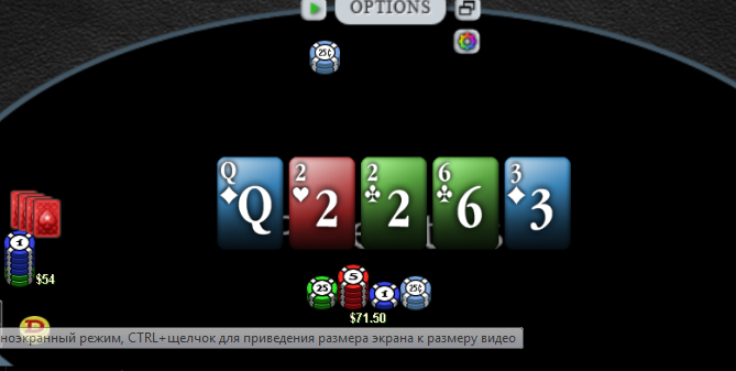 Допустим, по линии у оппонента тут одинаково вероятны: 1) двойка 2) стрит 3) две трефовые карты...