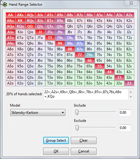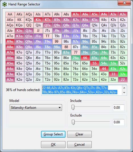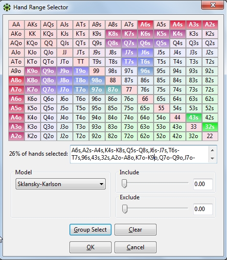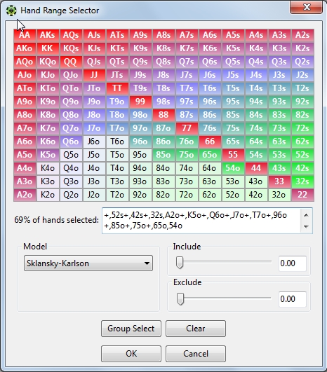 Raise SB Range Std. 69% (22+, A2s+, K2s+, Q2s+, J2s+, T2s+, 92s+, 82s+, 72s+, 62s+, 52s+, 42s+, 32s, A2o+, K5o+, Q6o+, J7o+, T7o+, 96o+, 85o+, 75o+, 65o, 54o)