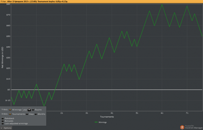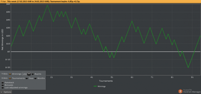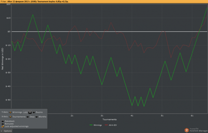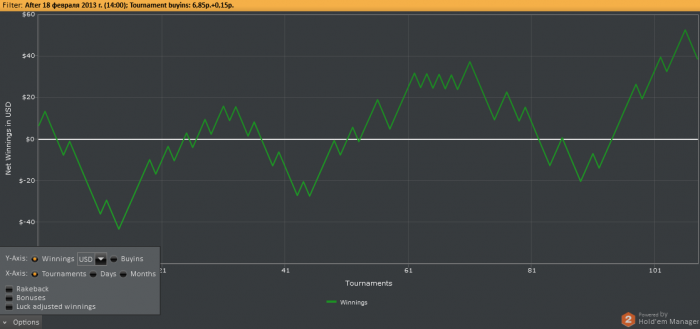 Вчера покатал не много семеры, пока что так: На этом графике присутствуют: злые реги, везучие фиши, небольшой недобор и самый важный гость тильт) Ну конечно и неуверенность, новый лимит всё таки, будем привыкать