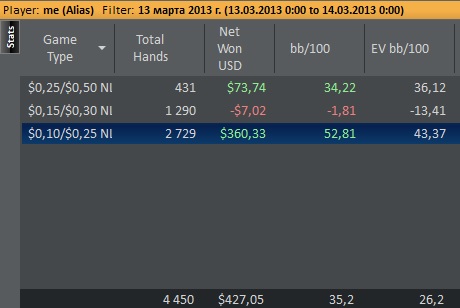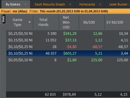 В начале месяца меня отпустил апстрик и наружу вылезли все мои ошибки в игре. Настроение скатилось в нули, начал немного подтильтовывать. Как результат - первые 30 тысяч рук в ноль. К середине месяца удалось собраться,. Начал просматривал по паре водов в день, завел тетрадочку куда записываю интересные мысли. Старался вообще не смотреть на результат сессии в хм/кешере, правда каждые 2-3 дня срывался :). Как нельзя кстати пришелся годмод день: Правда через день меня достал и ворст дей в -10би на нл25 за 3тысячи рук. Но в целом игра шла ровно, и я плюсовал. К сожалению концовку месяца полностью запорол, играл плохо и мало. Начались проблемы с психологией, после ряда проигрышей или своих ошибок начинаю злиться и входить в предтильтовое состояние. Как итог приходиться закрывать столы. В целом месяц в лучшем случае тянет на троечку.