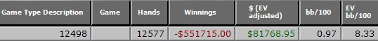 Итак, берем первого. Что означает недобор по фишкам при нормальных показателях по бб? То, что он проиграл определенное количество огромных аи на поздних стадиях, но в то же время (и это очень важно) выиграл много мелких аи в начале. Тут важно понимать, что второе обстоятельство позволило случиться первому. У второго же человека просто нет даже шанса проиграть крупный аи из-за постоянных вылетов на ранних/средних стадиях (без призов, что немаловажно). Думаю, очевидно, что положение второго значительно хуже.