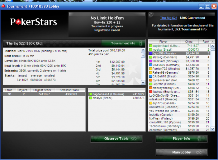 И так начали! Всем Удачи!! ------------------------------------------МАРАФОН ОКОНЧЕН!---------------------------------------- Пари на больший профит в МТТ 1. БайИн - 500$ с участника 2. Даты - с 5.03 до 5.04 3. Средний баин - без ограничений 4. Система выплат - winner takes all - $3000
