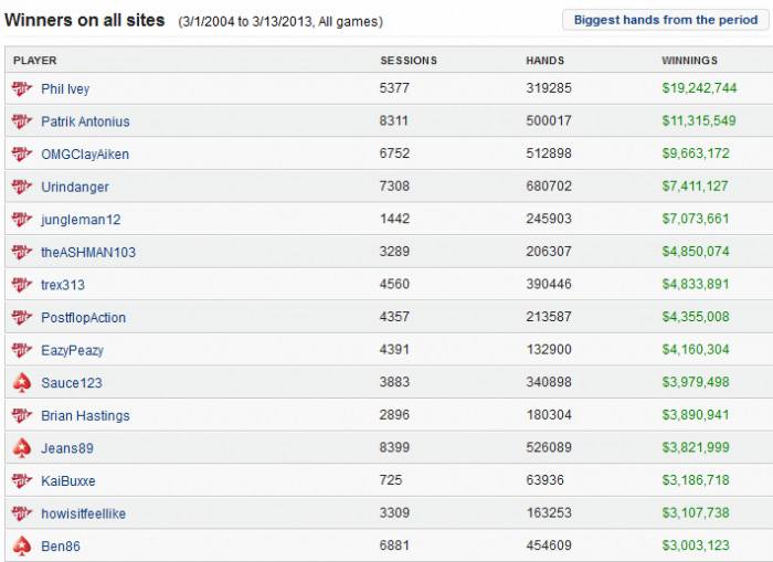 У Антониуса еще как миниум три ника на ФТП: finddagrind, Luigi66369 и I_Knockout_U А сколько не спалили и сколько он выиграл в европейский гавно румах, до того как стал ФТП про? Думаю он больше всех выиграл.
