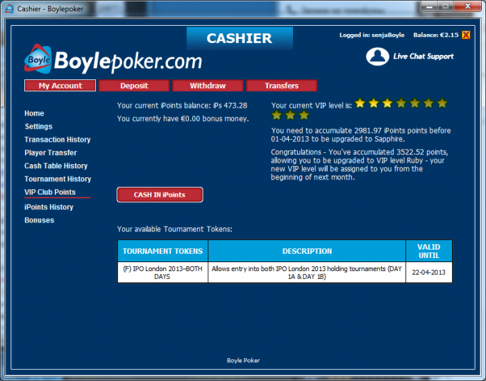 Поэтому продаю билет, buyin на это мероприятие 225фунтов, там 3 входных дня 17,18,18 апреля. есть еще информация об этом турнире на этом сайте: http://www.boylepoker.com/Promotions/IPOLondon/IPOLondon