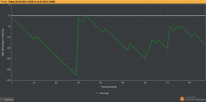 Закончил первый игровой день. Считаю, что с учетом жуткой непрухи, еще легко отделался В одностоловых СнГ это привело бы к заливу бр. Недобор по фишкам чудовищный, и смех, и грех. Ладно ныть, завтра продолжу, надеюсь подобное издевательство со стороны гсч прекратиться.