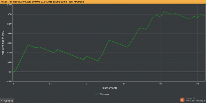 Идет акция по омахе, ну я решил не отставать. Играю практически все турниры акции за 5FPP, много дипранов в топ 20, итм больше 50%, профит в районе 10$