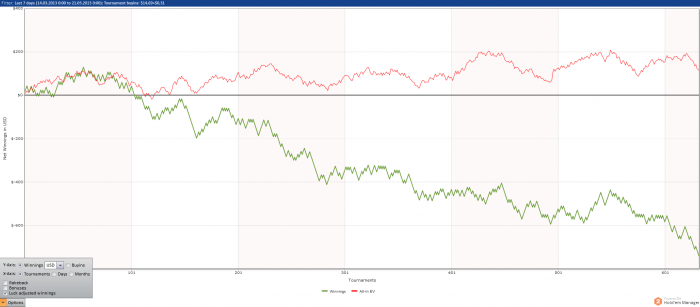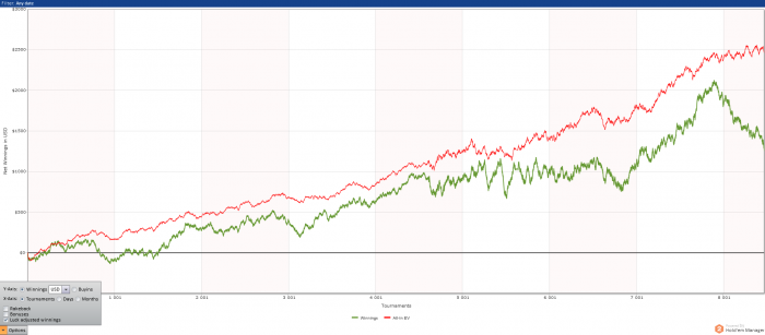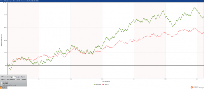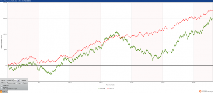 На графике семерки и пятнашки, пятнашек чуть меньше 4000 турниров. EV roi на 15 лимите около 2,5. Правда, если бы не было недодачи, я бы играл лучше, и рой был бы в районе 3-3,5%. Надеюсь не залиться до лета, летом исчезнет необходимость в кэшаутах и может быть получится накопить банкролл для лимитов выше. Ну или хотя бы для этого лимита. И к слову о БРМ в гиперах - лучше иметь 150-200 байинов лимита, а еще лучше не играть в них вообще.