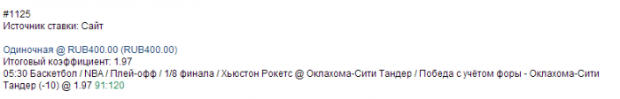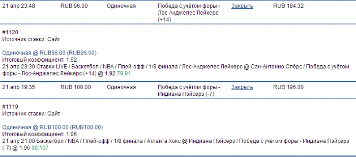 21 апр 06:30 Баскетбол / NBA / Плей-офф / 1/8 финала / Мемфис Гризлиз @ Лос-Анджелес Клипперс / Победа с учётом форы - Лос-Анджелес Клипперс (-5) @ 1.97 20 апр 23:00 Ставки LIVE / Баскетбол / NBA / Плей-офф / 1/8 финала / Бостон Селтикс @ Нью-Йорк Никс / Победа с учётом форы - Бостон Селтикс (+8.5) @ 1.92 20 апр 23:00 Ставки LIVE / Баскетбол / NBA / Плей-офф / 1/8 финала / Бостон Селтикс @ Нью-Йорк Никс / Тотал очков во 2-й четверти Бостон Селтикс - Больше 22 @ 1.85 21 апр 04:00 Баскетбол / NBA / Плей-офф / 1/8 финала / Чикаго Буллз @ Бруклин Нетс / Победа с учётом форы - Чикаго Буллз (+5) @ 1.97 21 апр 21:00 Баскетбол / NBA / Плей-офф / 1/8 финала / Атланта Хокс @ Индиана Пэйсерз / Победа с учётом форы - Индиана Пэйсерз (-7) @ 1.96 21 апр 23:30 Ставки LIVE / Баскетбол / NBA / Плей-офф / 1/8 финала / Лос-Анджелес Лейкерс @ Сан-Антонио Спёрс / Победа с учётом форы - Лос-Анджелес Лейкерс (+14) @ 1.92 05:30 Баскетбол / NBA / Плей-офф / 1/8 финала / Хьюстон Рокетс @ Оклахома-Сити Тандер / Победа с учётом форы - Оклахома-Сити Тандер (-10) @ 1.97